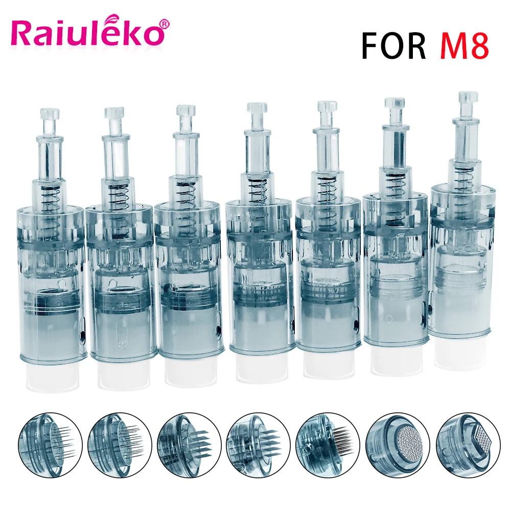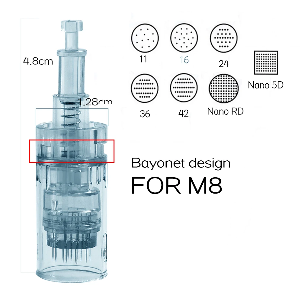 The M8 Cartridges Microneedle Replacement Needle Tips are designed for use with Dr. Pen devices, providing a variety of needle configurations for different skin treatment needs. These disposable tips are ideal for microneedling procedures, promoting skin rejuvenation and enhancing the absorption of skincare products.
