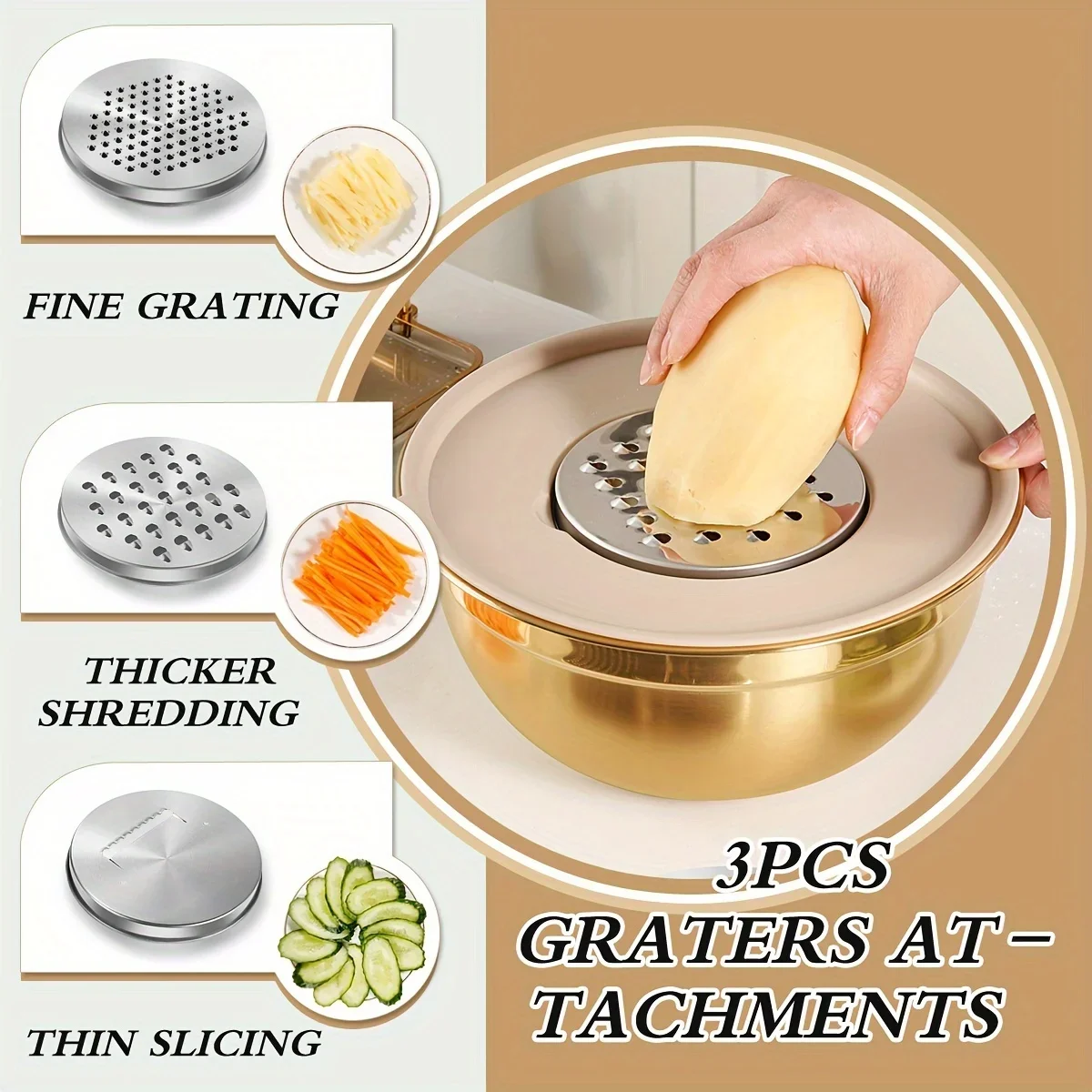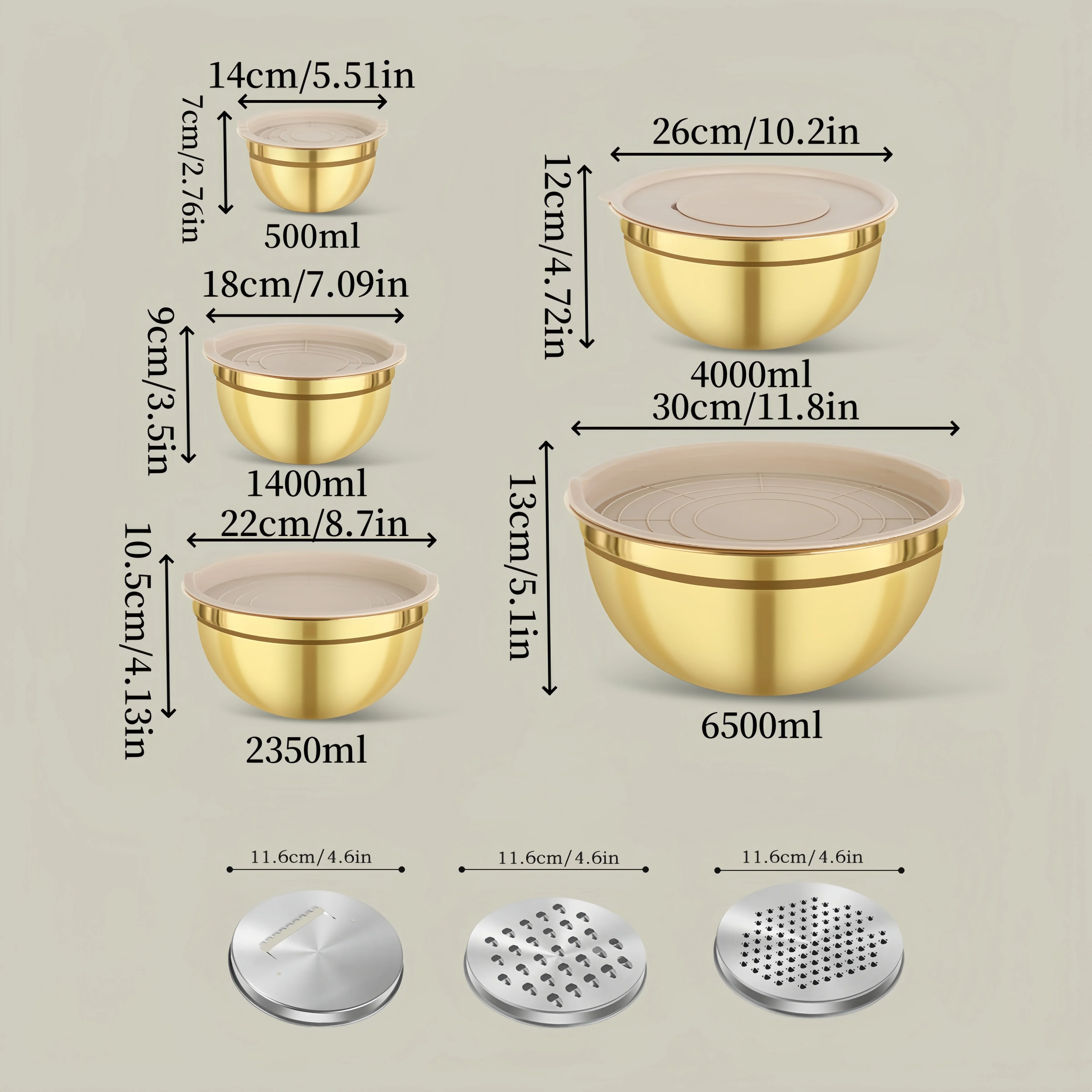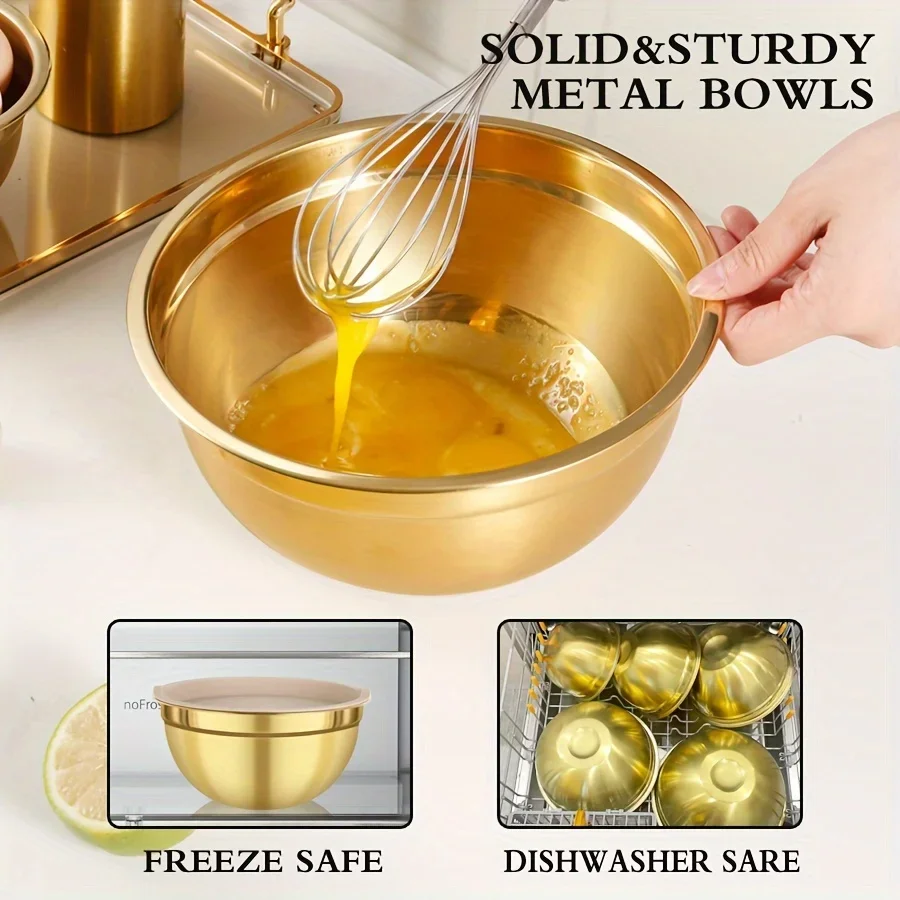 10-piece gold stainless steel mixing bowl set with lid and sharpener for cooking