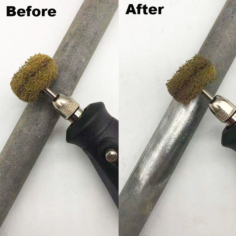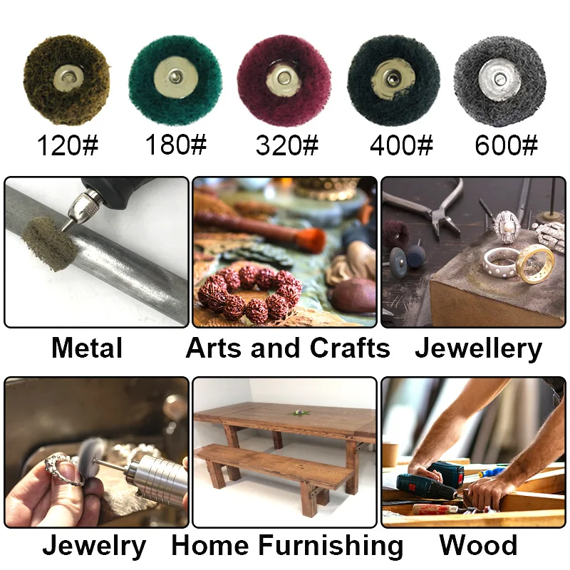This set includes 10 mini drill abrasive brushes designed for buffing and polishing. They are compatible with Dremel rotary tools and come with shanks of 2.35mm and 3mm, allowing you to choose the size that fits your needs. The buffing wheels have a diameter of approximately 1 inch (25mm), making them suitable for various applications.