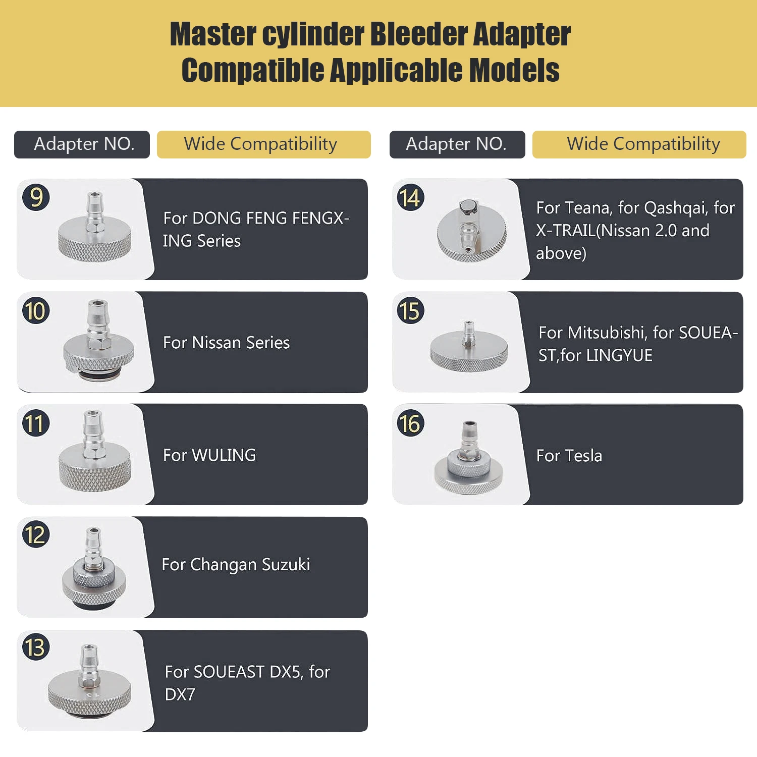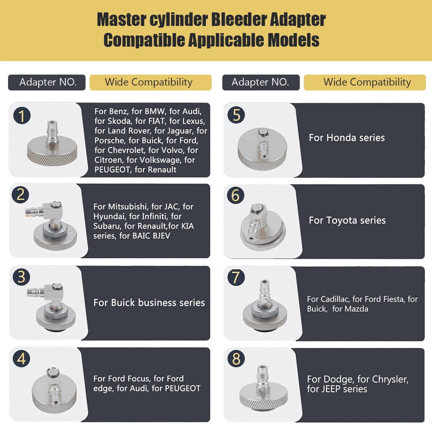 - [Extensive Compatibility] The adapters are compatible with numerous applications, including popular brands such as Benz, BMW, Audi, and Tesla, allowing for easy connection to brake bleed tools.