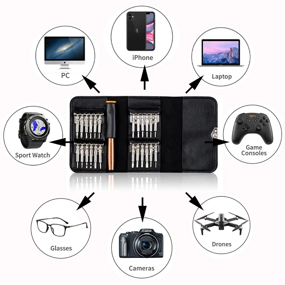 This 25 in 1 Mini Precision Screwdriver Magnetic Set is designed for electronic repairs, making it an essential tool for anyone working with devices like iPhones, cameras, watches, and PCs. Its compact and portable design allows for easy transport, ensuring you have the right tools at your fingertips whenever you need them.