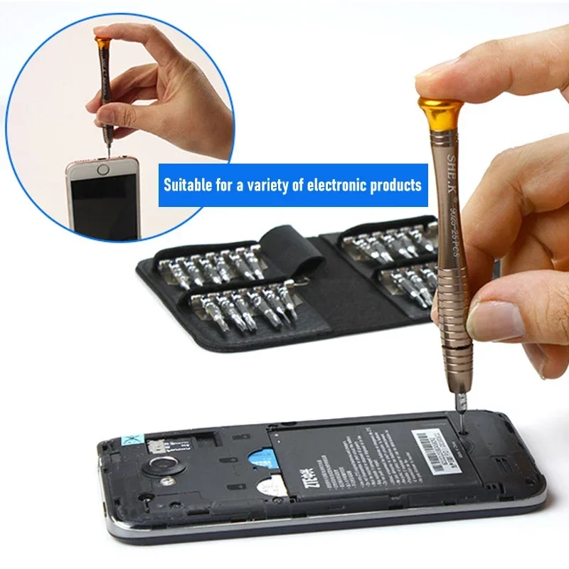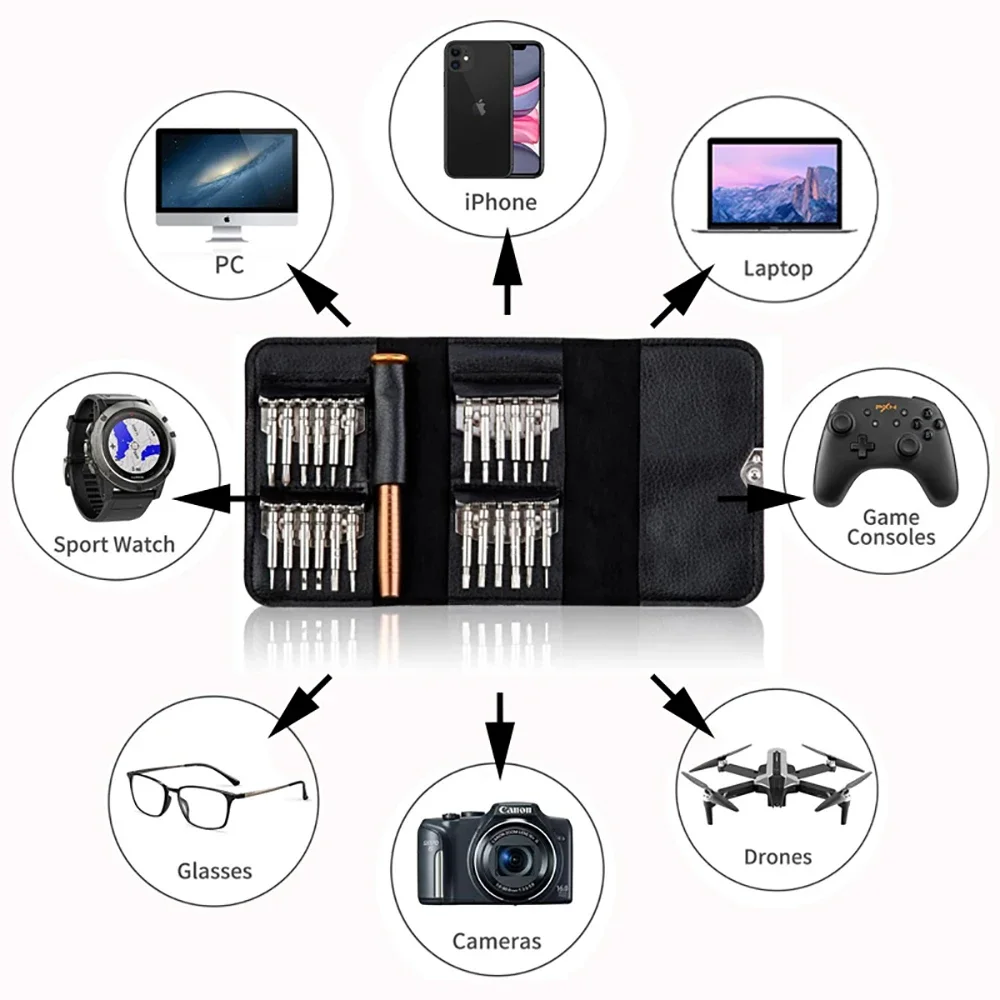 This 25 in 1 Mini Precision Screwdriver Magnetic Set is designed for various electronic repair tasks, making it an essential tool for anyone working with devices like iPhones, cameras, watches, and PCs. Its compact and portable design allows for easy storage and transport, ensuring you have the right tools at your fingertips whenever you need them.