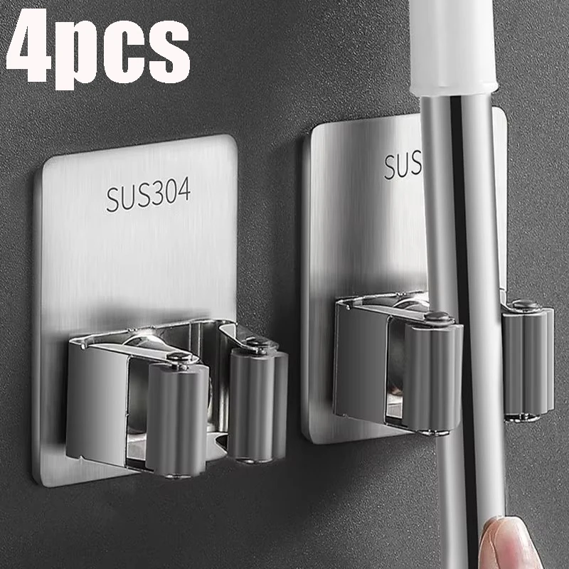 304 Stainless Steel Mop Clip Holder Bathroom Punch-free Mop Broom Brush Rack