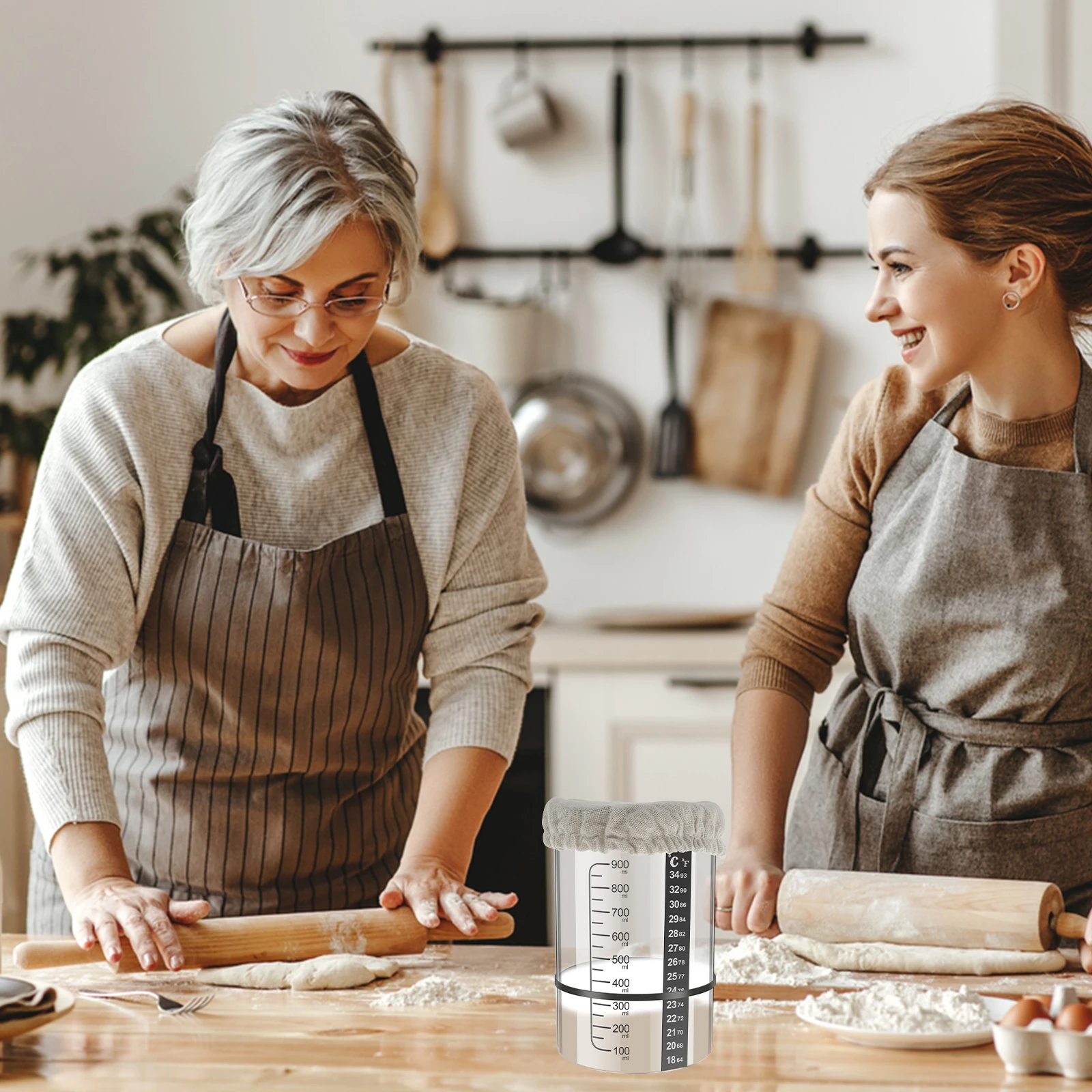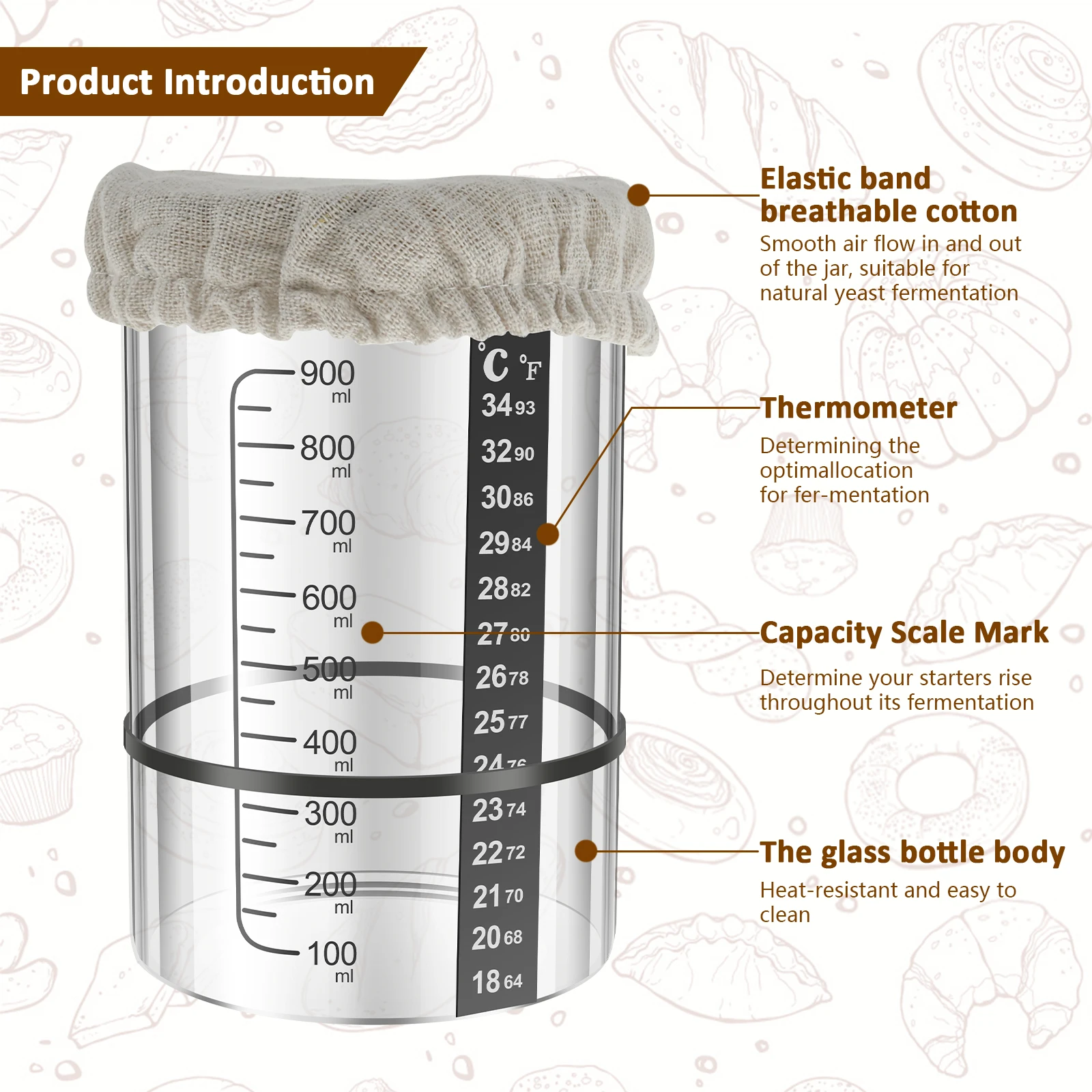 This Sourdough Starter Jar is designed for effective fermentation of sourdough, making it an essential tool for bread baking enthusiasts. The clear glass jar allows you to monitor the fermentation process easily, while the included accessories enhance your baking experience.