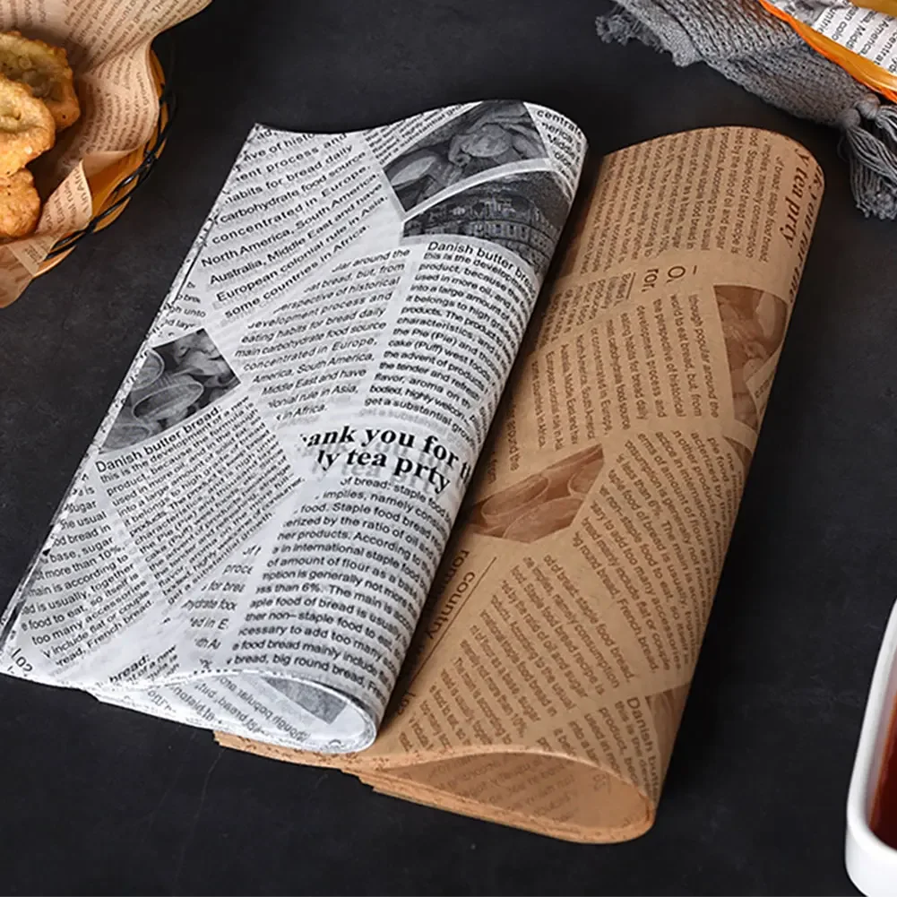 This food wrapping paper features a unique newspaper design, perfect for wrapping sandwiches, burgers, fries, and other fried foods. It is designed to keep your food fresh and appealing while providing a grease-free experience.