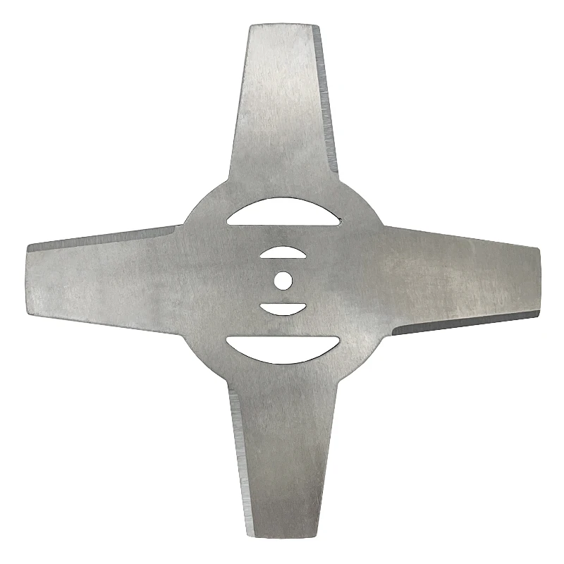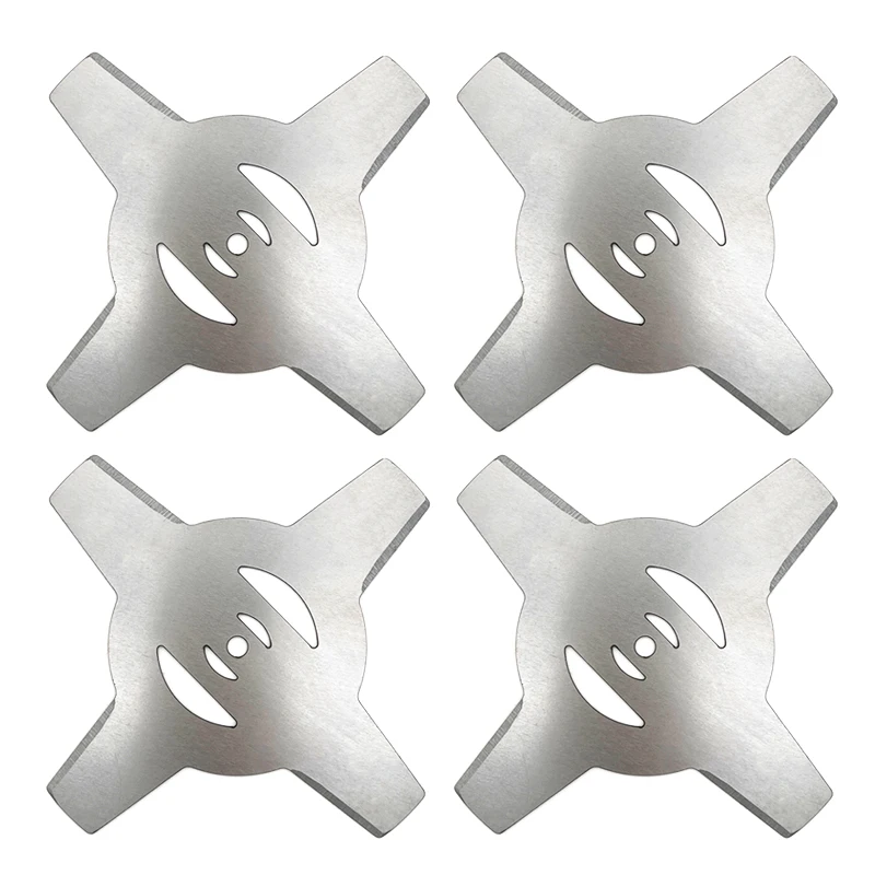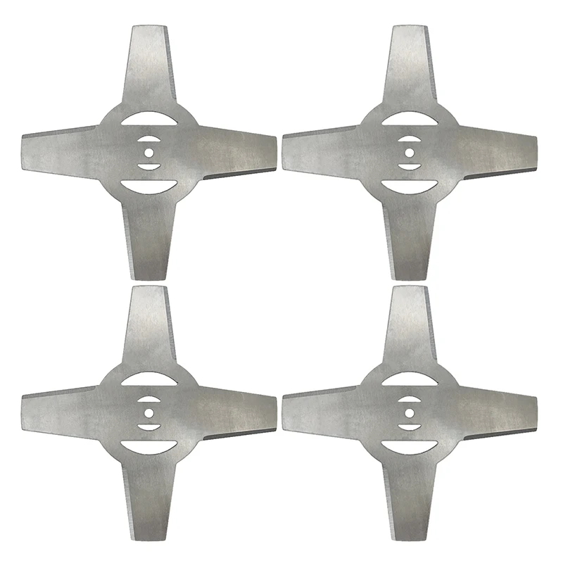 This product is a set of metallic blades designed for use with electric grass trimmers and brush cutters. Each blade features four teeth for efficient cutting performance.