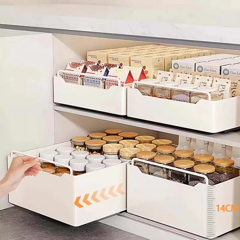This pull-out kitchen storage shelf organizer is designed to maximize your kitchen space efficiently. It features a sliding drawer system that allows easy access to your items, making it a practical addition to any kitchen or cabinet.