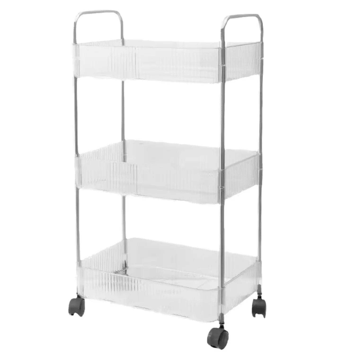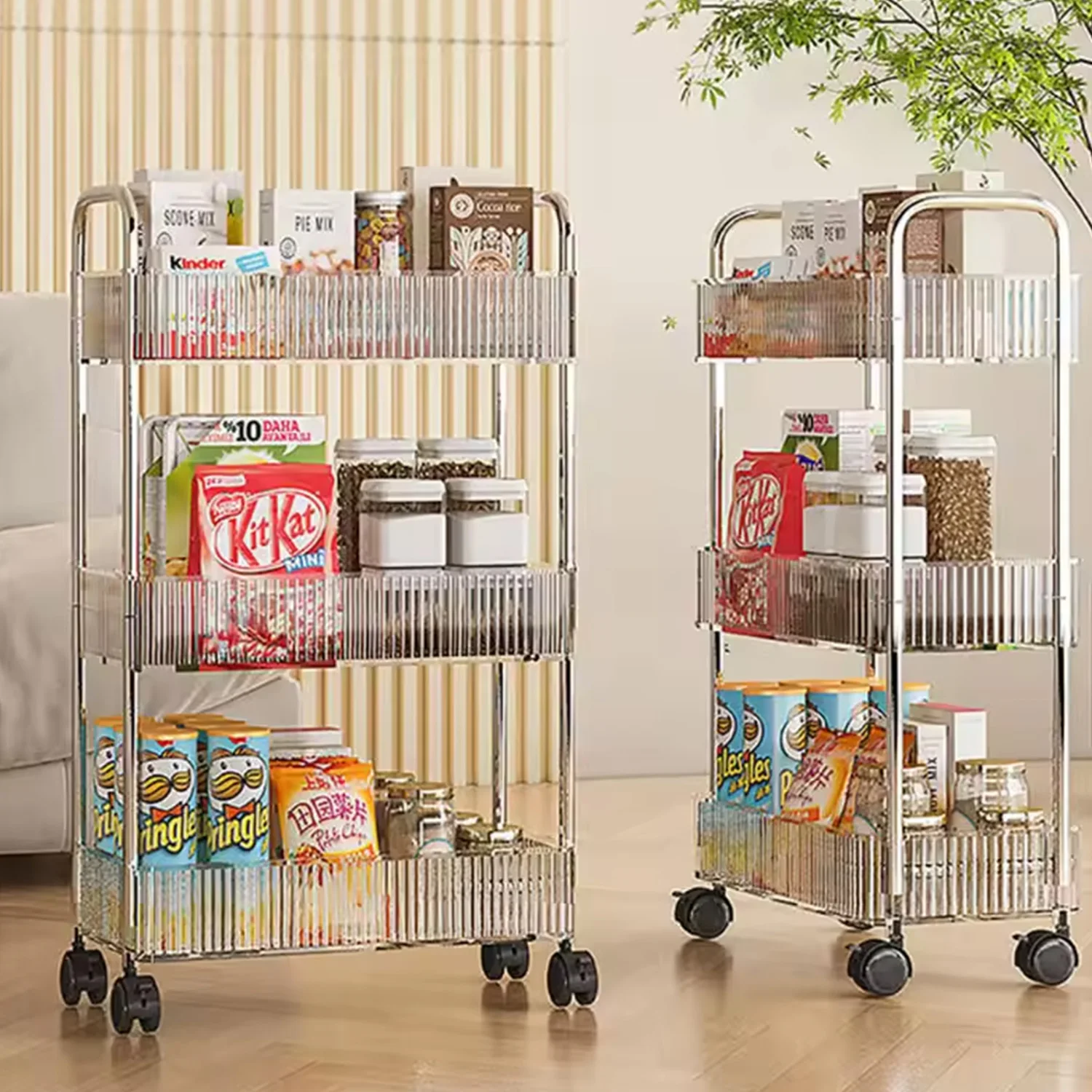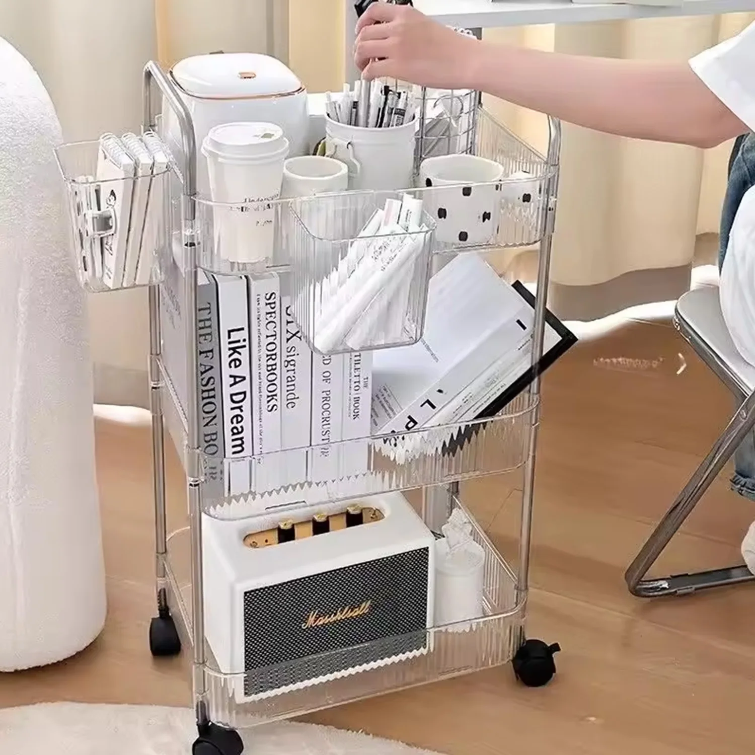 This mobile shelf with wheels is a versatile storage solution designed for organizing various items such as snacks, cosmetics, and other sundries. It features multiple layers and is perfect for use in living rooms or other spaces where you need extra storage.