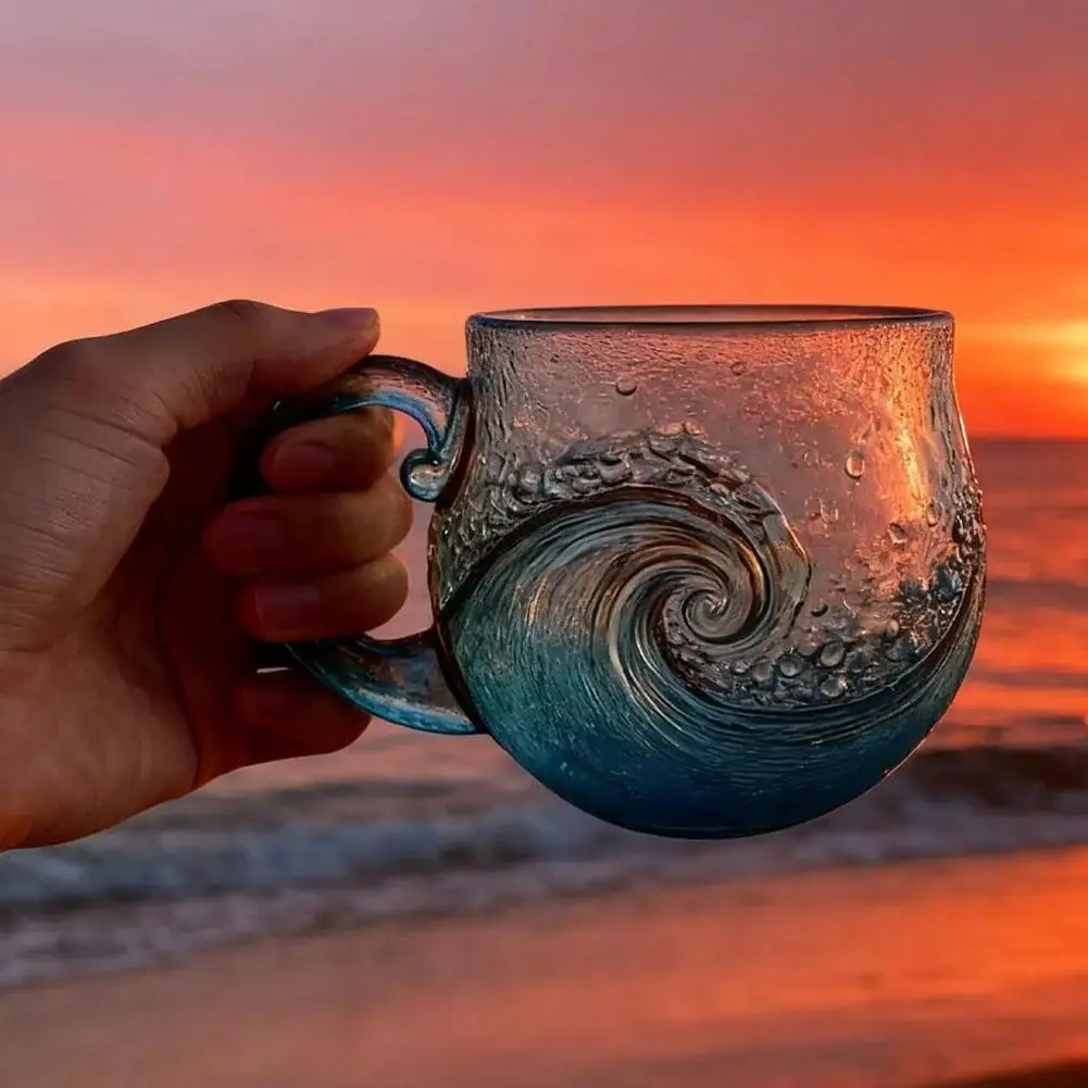 Sea Glass Wave Mug Handblown Ocean Wave Glass Mug Unique Textured Beach Theme