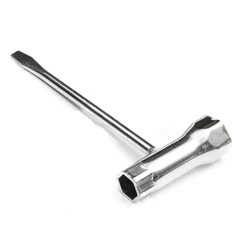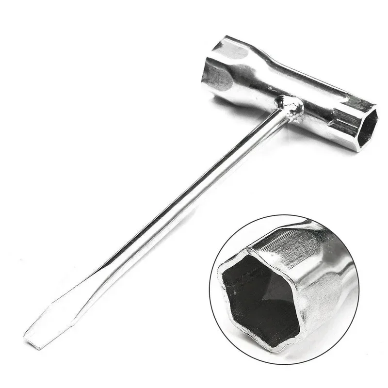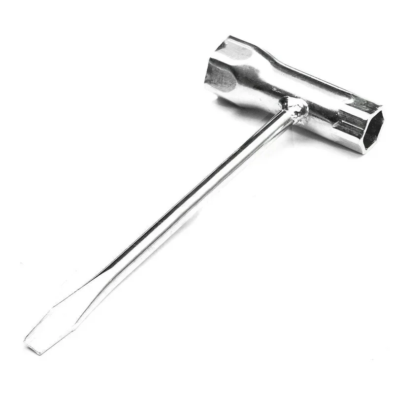 This Spark Plug Socket Wrench is designed for use with gasoline chainsaws and brush cutters. It features a combination wrench design with two sizes: 13mm and 19mm, making it versatile for various applications. The wrench is constructed from durable materials to ensure longevity and reliability during use.
