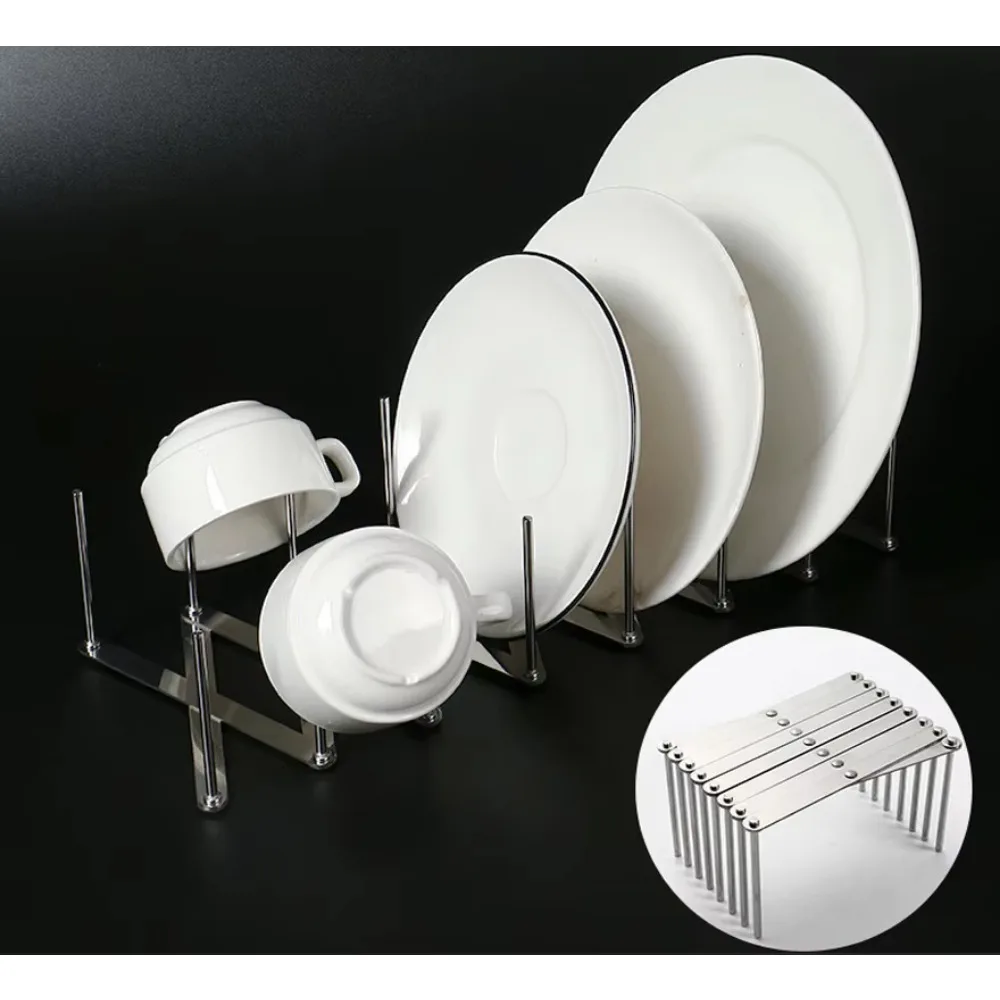 This retractable and foldable dish organizer is designed to efficiently store your kitchenware, including plates, bowls, and pot lids. Its versatile design allows for easy adjustment to accommodate various sizes, making it a practical addition to any kitchen.