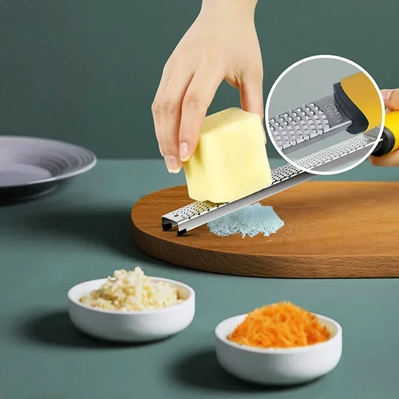 This stainless steel cheese grater and lemon zester is designed for effortless and safe grating. With a comfortable non-slip handle, it is perfect for grating cheese, zesting citrus, and more. Its durable construction ensures long-lasting performance in your kitchen.