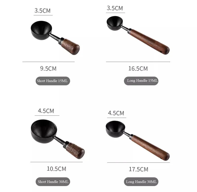 This coffee spoon set includes both short and long handle options, designed for measuring coffee beans and powder with precision. The elegant walnut handle provides a comfortable grip, while the stainless steel spoon ensures durability and ease of cleaning.